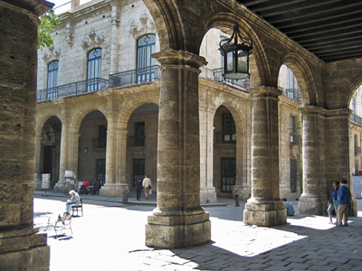 Images: (A) View from inside the colonnade of the Palacio del Segundo Cabo; (B) Castillo de la Real Fuerza; this is where the treasure was gathered for the annual Spanish fleets returning to Spain; now the Museo Nacional de la Cerámica Cubana is housed here; (C) El Templete, which, supposedly, is where the city of San Cristóbal de La Habana was officially founded in 1599; the city's first mass and first cabildo were held in it; (D) Mansion of the Conde de Santovenia, now the Hotel Santa Isabel.