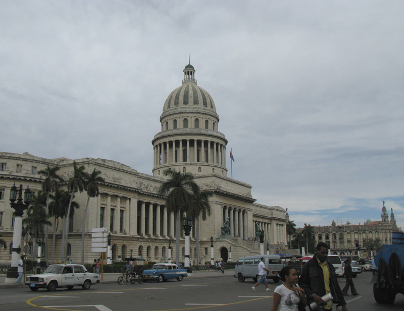 Comments: The architectural style of the Capitolio (Capitol, in English) is a combination of Neo-Classicism (from the 18th century) and Art Deco (early twentieth century). It was inaugurated in 1929 by Gen. Gerardo Machado (a presidential dictator). From 1929 to 1959, this building was indeed the Capitol of Cuba, but now it houses the Ministry of Science, Technology, and Environment. As you can see, the architecture generally imitates the U.S. Capitol building, but Cuba's is taller. To the right of the Capitolio is the Gran Teatro de La Habana.