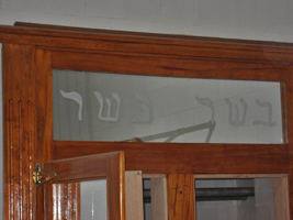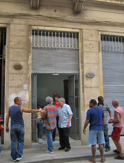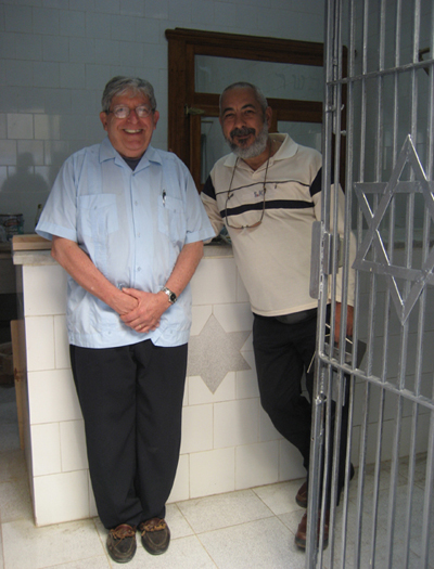 Comment: On the left, you see Dr. Schraibman of Washington University in St. Louis outside the kosher butcher shop in Old Havana surrounded by a number of Cubans. On the right, you see Dr. é Schraibman and Leonardo Padura at the counter in the butcher shop; the latter was researching Jews in this neighborhood for a novel he was writing. The shop was in the last stages of a complete remodel when this visit took place. In the upper right of the photo below you can see the Hebrew sign for kosher butcher.