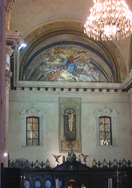 Comment: In Havana #25, it is noted that "the building's interior is not as remarkable as its exterior." While the façade is late Spanish Baroque, in this image you see the simple elegance of the building's 18th-century Neo-Classical style. Furthermore, in this image we see evidence of the parish's original name, the Catedral de la Virgen María de la Inmaculada Concepción. Notice the depiction of the Virgen Mary (Santa María) as the immaculate queen of heaven in the fresco at the top of the back or high altar wall.