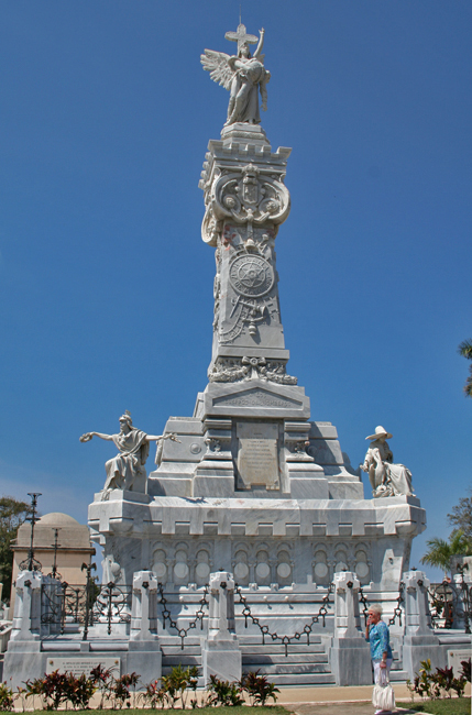 Comment: This magnificent funerary monument and tomb (Las Víctimas de la Caridad) is dedicated "A los cuerpos de bomberos" (to the companies of firemen). Citizens of Havana raised the funds to construct this monument with all its sculptures because a number of firemen from various fire companies died while heroically fighting a fire in the Isasí hardware store in 1890. The monument and the scupture on the top, which is the tallest in the entire cementery, was designed by the Spanish architects Julio Zapata and Agustín Querol.