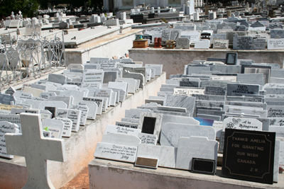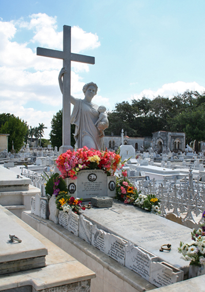 Comment: On the left you the beautiful tomb known as "La Milagrosa" (the Miraculous Lady), which does not refer to Santa María/the Virgin Mary, but rather to Amelia Goyri de la Hoz. On the right you see the testimonial tablets set up in her honor by those who have prayed to La Milagrosa for miracles and felt that their petition was granted. Amelia and her child both died in childbirth in 1901; she was 24 years old. Both were buried together. A few years later the tomb was opened and both Amelia and baby in her arms were still intact. Amelia's husband and the baby's father had been in such grief that he would go to the the tomb every day and never turned his back to it/them. Hence, Amelia became a symbol of "undying" maternal love, and thus the popular belief in Havana grew to the effect that she is the protector of pregnant women and newborn babies. In this way, her tomb is an object of pilgrimage and veneration. The sculptor was José Villalta de Saavedra (1909).