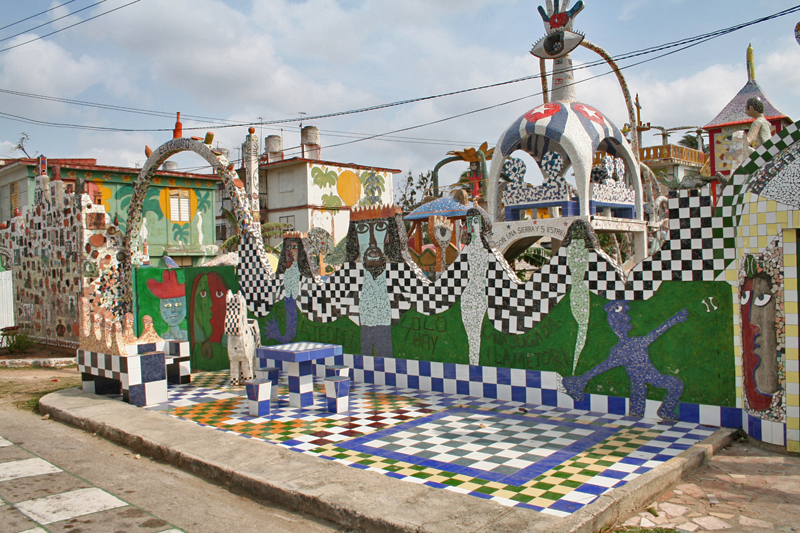 Fuster on Fuster : Throughout the four decades of my life as an artist, critics have clased me as a chronicler of my time. I disagree, because I think that an artist should reflect reality in his/her work. We, Cubans, have undergone tough times; but in spite of it all we have never lost "The Joy of Living," and this has always been the main subject in my work. (...) It was in 1996 that I decided to take my art to the streets with the aim of allowing people to take part in my project, and that is how I initiated my preliminary works in the community. At about this time my country was going through an extremely difficult economic juncture that was labeled the "Special Period." That phase affected my work because there was a shortage of construction materials, but in spite of it all I pushed on and took the decision to economically support all the expenditures. In my Community Project I work jointly with my neighbors, I make them accomplices of a sort in my Project: they contribute their ideas, tell me how they would like their houses' accesses to look, and I retain their criteria as a must in my work. (Fuster., pp. 22-23)