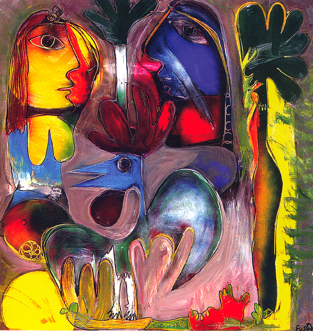 Comments: Vivid color; Picasso-inspired people's profiles; some vegetation; and a rooster: these are distinctive features of Fuster's art.