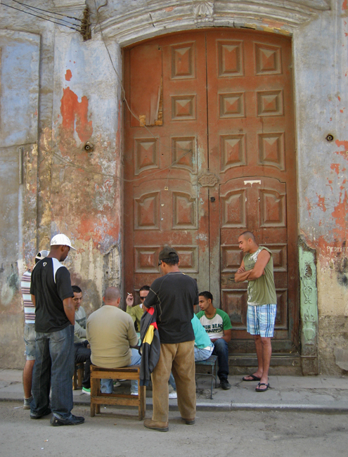 Comment: The seated young men are playing dominoes (damas) while the others are observing and kibitzing. According to the Web site eHow, Cuban dominoes is unique: "The game of dominoes is the national game of Cuba. In Cuba, you will see people frequently playing Cuban Dominoes in public areas. Cuban Dominoes is also played in Cuban centers in America. The following will show you how to play this unique game of dominoes." For the special rules of Cuban dominoes go to the eHow Web site.