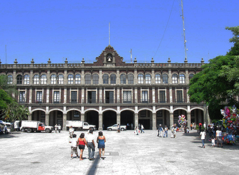 Source: WTL© photo 2009 taken on site in Cuernavaca. Image: Another view of the old central square (el zócalo) in the city's historical district (centro histórico). Comment: This is the city hall (ayuntamiento). Note that, unlike all other Mexican cities built on the Spanish Renaissance grid plan, the city's cathedral is not across the square and facing the city hall. Humanities Question: Describe the style of this building. |