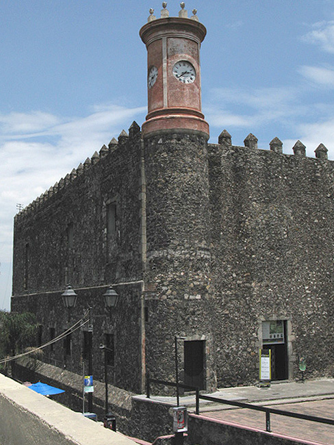 Source: WTL© photo 2009 taken on site in Cuernavaca. Image: Another view of the Palacio de Cortés. Comment: The door at bottom right belongs to a fine bookstore featuring works about history, art, and items of local interest. Humanities Question: What aspects of this building's architecture indicate that this "palace" was also intended as a fortress? |