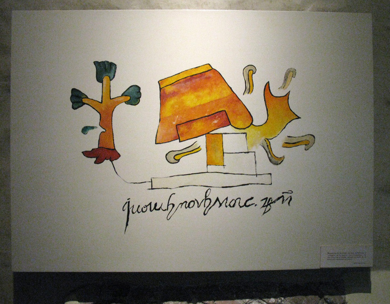 Humanities Question: Please analyze the complete image above given what you know about (a) the Aztecs, (b) Cuernavaca, (c) the Spanish conquest, and, especially (d) the difference between European writing and Aztec pictogram.