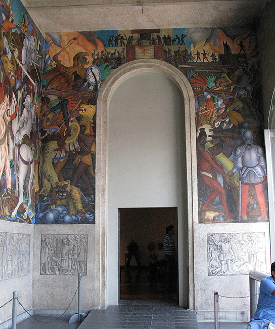 Source: WTL© photo 2009 taken on site in the Palacio de Cortés. Image: Diego Rivera's mural series "The Conquest of Cuernavaca" begins at the far right on the second floor (primera planta) on the back (east) side of the museum. Comment: Reading from the right of the door to the left, we see, in order, (a) the conquistadors invading Cuernavaca; (b) the Spaniards setting fire to buildings near the main pyramid; (c) indigenous Cuernavacans desperately offering sacrificial victims to this temple's god, Quetzalcóatl, in an attempt to get divine intervention against the invaders; (d) a battle melée between indigenous allies (eagle and panther warriors) of the Spaniards, Spanish conquistadors, and defenders of Cuauhnáhuac. Humanities Question: What does this opening wrap-around panel say about the three-way bellicose encounter between these contending groups? |