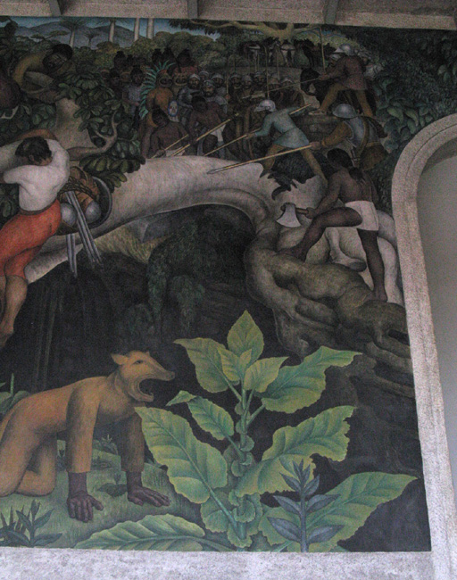 Source: WTL© photo 2009 taken on site in the Museo Regional de Cuauhnáhuac. Image: View of the mural on the left side of the empty alcove (seen on the left of the preceding page). This image and the following one together constitute one complete large mural panel, reading still from right (this view) to left (the next image). The reason why they are separated into two separate pages is technical; that is, it was impossible for the professor-photographer to capture the entire horizontal nature of this panel with the wide-angle lens on his small digital camera because there was not enough room on the balcony to stand far enough away from the mural. Hence, he took two vertical shots. Comment: Cuernavaca is situated geographically on a series of ravines (barrancas), cliffs, and gullies, and the vegetation is exuberantly semi-tropical. Humanities Question: Using the next page (#8d), answer this question: How does this part of the mural tell the story of how difficult it was for the Spaniards to enter Cuernavaca by force and, therefore, how difficult the conquest of this well-defended strategic city was for the conquistadors? |