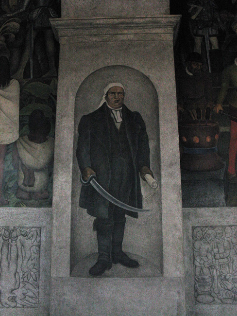 Source: WTL© photo 2009 taken on site in the Museo Regional de Cuauhnáhuac. Image: A mural painting by Diego Rivera of Morelos in the alcove, as you can see, to the left of the preceding panel. Task: Find the pages on Morelos in the HUM 2461 textbook and in the Cuernavaca pages (link below). Humanities Question: Placing Morelos in this place in the mural in anachronistic, right? Speculate on why Diego Rivera chose to place an image of Morelos. (Hint, there is a lot to say in response to this topic; it's not an idle observation.) |