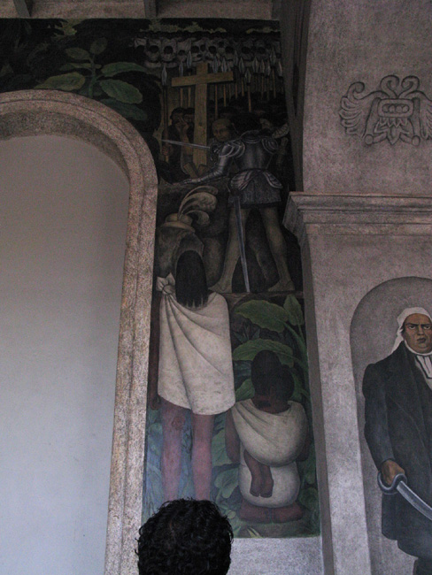 Source: WTL© photo 2009 taken on site in the Museo Regional de Cuauhnáhuac in the Palacio de Cortés. Image: A tourist (back of man's head) came between camera and mural when this shot was taken. Humanities Question: What does this slim part of the mural tell us as the narrative sequence continues to the left of the Morelos' alcove? |