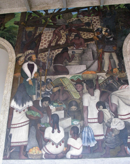 Source: WTL© photo 2009 taken on site in the Museo Regional de Cuauhnáhuac . Image: Continuation of the mural titled "The Conquest of Cuernavaca" by Diego Rivera. Comments: Here we see indigenous Cuernavacans at the bottom with some kind of market cornucopia; Hernán Corté middle left overseeing the scene below and the scene above; and, above, indigenous workers supervised by a pair of Spanish soldiers working on some sort of building. Humanities Topic: Putting together the comments above with what you know about (a) Hernán Cortés, (b) Cuernavaca, and (c) indigenous Mesoamericans, write a paragraph about this panel of the overall mural. Note: Segmented detailed views of this panel follow in the next few pages, in 8i and 8i bis. Use these pages when you respond to the Humanities Topic above. |