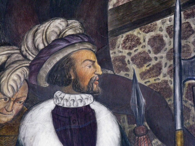 Source: WTL© photo 2009 taken on site in the Museo Regional de Cuauhnáhuac. Image: Detail of the panel shown in page 8h. Comment: Concerning a scholarly controversy about Diego Rivera's depiction—and, therefore, visual interpretation—of Cortés, see the mural in: => Diego Rivera Page 21 and => 21a. Humanities Topic: Use this image to respond to the humanities topic in page 8h. In addition to that topic analyze this image as if it were a separate painting outside the context of the full panel. What kind of conquistador does Diego Rivera suggest Cortés is according to this detail in the mural? |