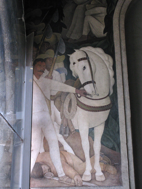 Source: WTL© photo 2009 taken on site in the Museo Regional de Cuauhnáhuac in the Palacio de Cortés. Image: The final panel in Rivera's monumental mural series on "The Conquest of Cuernavaca." To the left of this panel is the edge of the balcony on the open back side of the museum's second floor; to the right is a door entering the balcony. Comment: Here we see Emiliano Zapata holding the bridle of his famous horse, whose name was 7 Leguas (Siete Leguas / 7 Leagues). What other figure of Latin American (indeed, European) iconography shows a hero and a white horse with a fallen victim at his feet? (Hint: go to the HUM 2461 pages on Tlatelolco for a possible answer.) Why end this series of panels in Cuernavaca with Zapata? Humanities Questions: (A) Who was Emiliano Zapata? (B) Why was he a significant figure in the history and culture of Cuernavaca? (C) What does the name "7 Leguas" (i.e., 7 Leagues) remind you of in terms of Mesoamerican humanities? (D) To what does "seven league boots" refer in European folklore? Embedded Image: In 1932 Rivera produced a painting of the full image, which, due to space limitations, was squeezed into this last space in the museum's second-floor balcony. See: => Museo de Cuauhnáhuac, 8l bis. For an image of Emiliano Zapata seen at the very beginning of HUM 2461, see: <= Opening Slide Show 2, #58. |