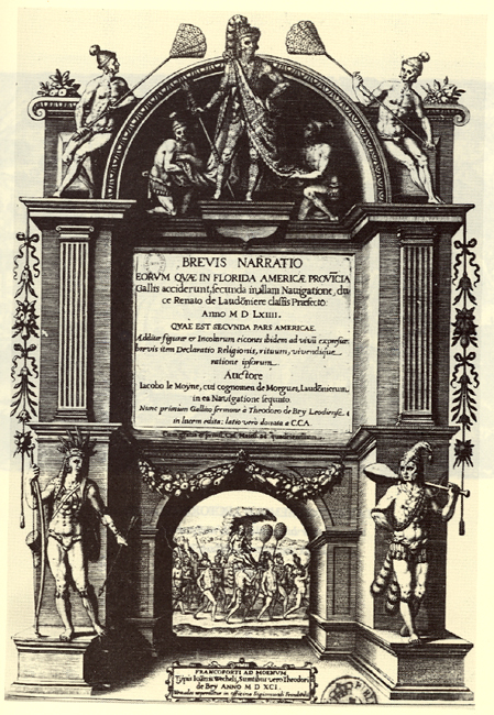 Source: Michel Duchet, L'Amérique de Théodore De Bry. Paris: Editions du Centre national de la recherche scientifique, 1987, p. 151. Images: European Renaissance title page Metaphors: Idealized (Latinized) indigenous Timucuans Perspectives: (A) Latin title of French publication with Timucuan scene drawn (painted) by French artist and engraved in Belgium Cultural humanities: (A) Illustration; (B) Colonial French Florida |