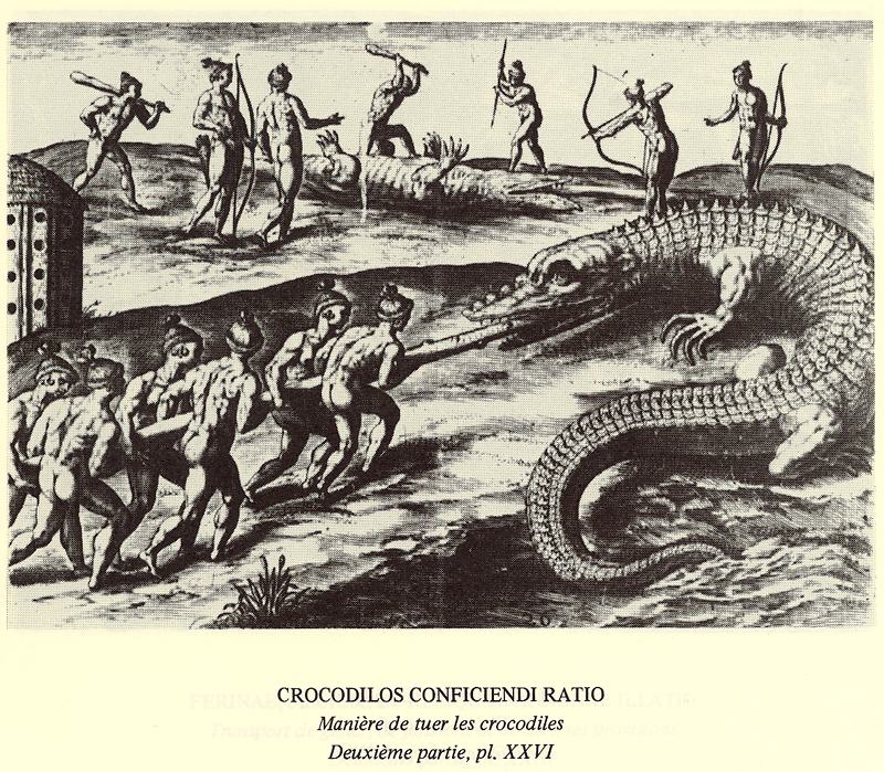 Image: Lithograph of French artist Jacques LeMoyne's interpretation of a scene from Florida and Flemish lithographer Theodor DeBry' lithograph of LeMoyne's original art work of Timucuan hunters killing crocodiles near their hunting hut.