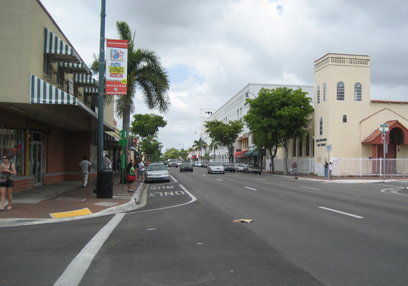 Comments: In no small measure, Miami's stature as a great international city is due to the more than a half millions Cubans who began arriving in Miami in the 1960s. This street, Calle 8 (8th Street), is the hub of Florida-Cuban cultural life in a neighborhood known as Little Havana. Greater Miami has a population of about 410,000, but the metropolitan area has nearly six million residents. Due in large measure to its geographical location near the Straits of Florida that separate Florida from Cuba, Miami is a city connected to the world by air, ship, finance, politics, ethnicity, and demographics. Miami is a dramatic city due to its more than 50 skyscrapers and spectacular coastal vistas and neighborhoods. The first inhabitants were the Tequesta people, who date back to at least a thousand years ago. Later, the Timucua native people northeast Florida migrated via Miami on their journey from Venezuela to Florida. Relating directly to Latin American humanities, Pedro Menéndez de Avilés, the founder of San Agustín / St. Augustine to the north, claimed the Miami area for Spain in 1566, and a year later the first Spanish Catholic mission was built there. Miami finally became an incorporated American city in 1896. It was actually founded by a woman from the Miami region of Ohio. Major growth came after World War II and in the 1960s. Because of Miami's reality as the "Gateway to Latin America"—a title contested by other cities like Houston and Los Angeles—and because over 65% of Miami's population is of Hispanic origin (Spanish is also the native language of over 65% of the city's population), in this course we are now going to take a brief look at the city's Cuban core core. Of historical note is the fact that, when England took possession of Spain's colony of La Florida in 1763, most of the Hispanic Floridians, their Indian allies, along with their slaves, and free blacks fled from Florida to Cuba. Many of these diasporic people returned in the Second Spanish Period (1783-1821), but others stayed in Cuba. It is likely, in a curious historical turnaround, that not a few of the Cubans who fled the Castro regime after 1960 were descendants of the original Hispanic Floridians and Afro-Floridians who fled in 1763. Finally, the following simple fact may help illustrate Miami's orientation among world cities. Miami has twelve official sister cities: Bogotá, Buenos Aires, Lima, Madrid, Port-au-Prince, Santiago, Salvador da Bahia, Santo Domingo—all in Latin America—and four more, Nice, France; Qingdao, China; Varna, Bulgaria; and Kagoshima, Japan.