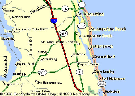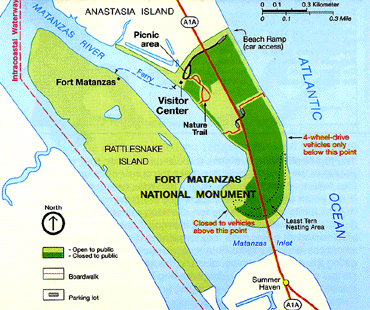 Source: The map on the left shows the modern general area of St. Augustine and the relationship between the city and Fort Matanzas. The map on the right is taken from the brochure provided by National Park Service at Fort Matanzas. It shows how to get to the fort on Rattlesnake Island from Anastasia Island. The tour that follows is intended to motivate you to visit this national monument and to stimulate imagination about tragic conflict that took place between the first French and early Spanish ("Latin" Americans both) in our region of Latin America. |