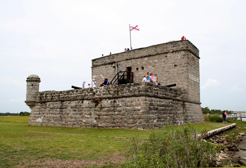 Image: The fort is 50 feet square, and the tower is 30 feet high. It is built of coquina stone. Here you see tourists from the ferryboat I was on approaching the fort. Also, you can see the flag flying over the fort. Florida's, not the USA's.