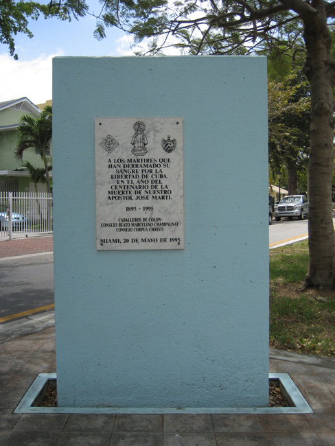 Comment: All this photo shows is a standing slab of cement with a plaque on it a little farther down 13th Street in the Cuban Memorial Plaza. Translation of the plaque: "To the martyrs who shed their blood for Cuba's freedom in the centennary year of the death of our apostle José Martí. 1895-1995. Knights of Columbus. Blessed Marcelino Champagnat Council. Corpus Christi Council. Miami, May 20, 1995. (The priest honored by the afore-mentioned council, Marcelino Champagnat, 1789-1840, was a French priest who was beatified--hence the title mentioned above--by Pope Pius XII in 1955 and who was canonized by Pope John Paul II in 1999, after the plaque was made.)