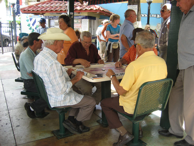 Source: Photograph© (2009) by WTL of people playing dominoes (and other board games including chess) in Máximo Gómez Park. This park is also known by the popular name of Domino Park, because of what you see here.