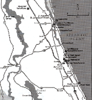 Sources: The map in the left box helps us situate St. Augustine on a rough contemporary map within a region that goes from the Atlantic Ocean to Palatka and from the World Golf Hall of Fame to Lake George. Note that this map shows the central portion of what is called the "First Coast." The name of this coast plays on the public relations idea that first equals best, perhaps; but it is also rooted in the idea of the first permanent and continuously occupied European-based settlement in what is now the United States of America. Note 1: Pedro Menéndez de Avilés first sighted Florida off the coast of Cape Canaveral (Cabo Cañarreal) on August 28th, the Catholic feast day of St. Augustine, bishop of Hippo (present day, in Algeria). Actually, it is thought that Ponce de León may have landed on the north side of the city in 1513 when he was supposedly looking for the fountain of youth (history? myth? legend?), although the actual landing place could have been 30 miles north or south of this site. The Fountain of Youth Archeological Park attraction was originally the site of a Timucuan village and the first Catholic mission in the Western Hemisphere. This attraction is now an amusement park, archeological site, and quasi-historical site. On September 8th, 1565 , Menéndez de Avilés landed on this site, claimed most of the land mass of North America for Spain, founded a colonial settlement he named San Agustín, and, with invited Timucua onlookers, had father Francisco López de Mendoza Grajales say the first Catholic mass in North America (September 8th is the feast day of the Birth of Santa María, Virgin Mary). San Agustín / St. Augustine is the oldest city of continuous occupation in what became the United States. Note that the first settlement was at the Timucuan village; soon it was moved across the bay to Anastasia Island; in 1572 it was moved back to the mainland where it has remained ever since. Note 2: For a short discussion of (a) the 450th anniversary celebration of the founding of St. Augustine in 2015 and (b) Menéndez de Avilés and his landing at St. Augustine aboard his famous galleon, el galeón San Pelayo, see: => Menéndez. Note 3: The map on the right is a Spanish map from 1788. For an enlargement of this map, see: => San Agustín #1a. This is the right side of a city map called the "Plano particular de la Ciudad de San Agustín de la Florida..." It is dated April 25, 1788. Notice (1) the "castillo" (so called in Spanish) on the far right; (2) toward the left, the cathedral (the building near the central plaza with the cross on it; (3) the (slave) market (officially called the Public Market) pavillion near the shore on the bottom (E) side of the plaza on the left; and (4) the government building with the patio in the center on the top (W) side of the plaza at the upper left. Note 4: On September 18, 2015, the current and real king and queen of Spain visited St. Augustine, whose sister city is in Spain, as part of the celebration of the 450th anniversary of the founding of the city on September 8, 1565. For a view of them during their visit, see: => Felipe VI. Humanities Questions: (A) What significance can be attached to this notion of "first" (Latin) American city? (B) What is left today of these terms' ("first city" and "St. Augustine") origins? (C) What do these terms mean to you and to others now? (D) What value does the idea of these terms have for Florida's current status and Latin American humanities? |