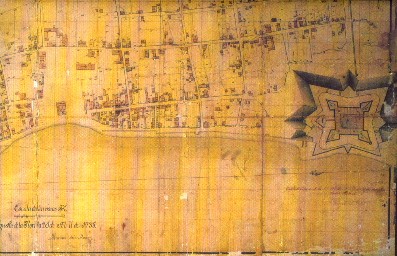 Source: This is a copy of a Spanish map of San Agustín drawn by Mariano de la Rocque on April 25, 1788 in the second Spanish period. He was a French engineer, and it is believed by scholars that it was commissioned by the Spanish Colonial Governor. It is titled "Plano particular de la Ciudad de San Agustín de la Florida..." (Detailed city map of Saint Augustine, Florida). Comments: A legend accompanying this map detailed lot sizes, construction materials, the kind of roof and the number of stories for each building in the city. In fact, when restoration of colonial Spanish San Agustín began in 1960, this map was used to certify the accuracy of the restoration projects. Humanities Questions: What is the name of the colonial period specific to Florida during which this map was created? Given the information that accompanied this map, what purpose do you think this map served? Additional: For a current tourist map of this northern end of Old St. Augustine, see: => San Agustín #1b. For a modern drawing of the Castillo de San Marcos, see: => San Agustín #1c. |