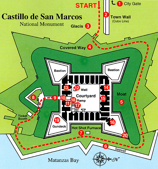 Comments: This kind of fortification is called a "star fort." (Strictly speaking, it is not a castillo or castle.) It was created when gun powder began to be used in European warfare in the middle of the fifteenth century. The special innovation in this kind of aggressive fortification is its flatness with triangular corner bastions, which were designed to provide fire cover between them. In additiuon, a ditch or dry moat was added around the fort. For the Castillo de San Marcos, as you see, the moat was needed only on the three land sides because the fourth side was protected by Matanzas Bay. When star forts were developed, warfare shifted from open pitched battles among two or more knights and peons to siege warfare. This castillo/fort withstood two such sieges. The first took place in 1702 when British governor of Carolina attempted to capture Spanish San Agustín. This city's residents (1,200 people) entered the fort with 300 soldiers, stocked food, sheltered their livestock in the moat, and withstood a siege that lasted two months. British cannonballs did little damage to the fort because the coquina stone (native to Florida) was able to absorb the impact of the cannonballs. Finally, when Spanish ships arrived from La Habana, Cuba, the British fleet was trapped in Matanzas Bay; the British burned their ships and fled back to Carolina on land, but the British did manage to burn down much of the city outside the "Castillo." The second siege occurred in 1739, during the so-called War of Jenkins' Ear (1739-1742) between Great Britain and Spain, which Spain won). This time the famous British General James Oglethorpe (founder of the English Colony of Georgia) besieged San Agustín. Again the Spanish governor—this time, Manuel de Montiano—gathered the city within the Castillo while Oglethorpe landed on Anastasia Island. While his cannons were firing on the fort, a Spanish ship from San Agustín managed to get through the British naval blockage at the mouth of Matanzas Inlet and sailed to La Habana. When this boat returned from Cuba, the British had already abandoned the siege because the fort's coquina walls once again successfully withstood the bombardment.