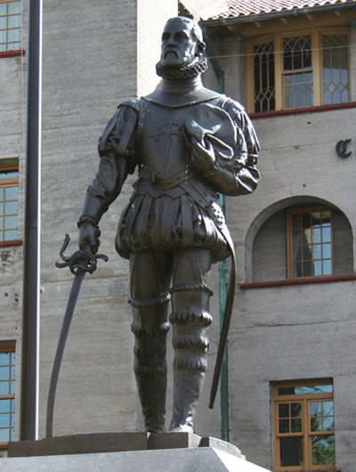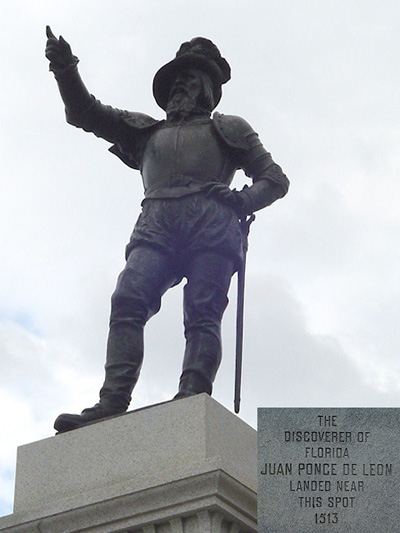Sources: Photos by WTL© (2007 and 2008). Images: The photo on the left shows Juan Ponce de León (1460—1521), who probably landed in what is now St. Augustine in 1513. He stood 4'11" tall. This statue stands prominently between the Plaza de Armas on the north and the A1A Ale Works brewery and restaurant on the south on Avenida Menéndez, which runs north-south along the city's sea wall (el malecón) on the Matanzas Inlet. The statue also stands next to the old slave market (officially: Public Market) at the eastern head of the principal town square, the Plaza de la Constitución. The statue on the right is of Menéndez de Avilés (1519—1574), and it stands in front of Flagler's first hotel in St. Augustine, the Ponce de León, which is now home to Flagler College, a private liberal arts college founded in 1968. (1) Ponce de León is associated with Columbus's second voyage, various Caribbean "discoveries" and conquests, and the death of Indians on Puerto Rico, Cuba, and in Florida. He named the peninsula and all the land north and west of it La Florida because he landed on the Florida coast in the Eastern season. (By the way, Pascua Florida Day, April 2, is a legal holiday in Florida.) He died in 1521 when attempting to establish a settlement on the Caloosahatchee River in Charlotte Harbor, Florida. The Spanish colonists there were attacked by Calusa Indians; Ponce de León was fatally shot with a poisoned arrow. For another humanities view of Ponce de León, please link to => the Cummer Museum in Jacksonville. For still another humanities view, this one a contemporary 2009 view, see: => The major glass artist Therman Statom's exhibition on "Stories of the New World," which the artist says deals with the contemporary implications of Ponce de Leon's search for the legendary fountain of youth in Florida in 1513. At a minimum, Statom's major multi-media exhibition on this theme shows that Ponce de León's actions five centuries ago have creative humanistic vitality today. (Statom has pertinent ancestors in his background.) (2) Pedro Menéndez de Avilés is considered by the citizens of Avilés, Spain, to be one of their most illustrious historical figures. From an early age he was a skilled marine pilot and sailor. From 1556 on he was promoted to the rank of admiral (Capitán general de la Armada), and he was a member of the prestigious knightly (chivalric) Order of Santiago: notice the cross on the armor on his chest. According to Justo Ureña y Hevia, chronicler of Avilés, Menéndez de Avilés was "an extraordinary seaman, an intelligent and brave soldier, a sensible and generous governor, a skillful diplomat, a peacemaker, a traditional devout Spanish Christian ... a wise man, a veritable Renaissance figure of his age ... fond of family, honest, noble and truthful..." (St. Augustine, Florida; San Agustín, Florida; Avilés, Spain; Avilés, España. Avilés, Spain: 2001, n.p Copyright © 2001, Foto Angelín, S.C.). He also massacred the French Huguenots (i.e., Protestants) at Matanzas inlet. For further images and a discussion of Menéndez de Avilés and his historic landing in St. Augustine in 1565, see: => Menéndez. Humanities Questions: (1) What similarities and differences do you notice between the two statues? Associate your answer with the information above or with what you may find in other resources. (2) What are your first and second reactions to Therman Statom's exhibition at the Orlando Museum of Art (OMA) in 2009? |