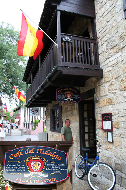 Source: WTL photograph© June 2007. Image: Restaurant/cafe on St. George Street in St. Augustine's historic tourist neighborhood. Comments: Now we see a much newer building in the heart of old St. Augustine. In this case, a stone building with a Spanish-style balcony. This cafe serves French and Italian food and specialty coffees. In other words, it's a very popular and modern establishment that happily caters to the average of 5,000,000 tourists attracted annually to St. Augustine. Latin American humanities: Spanish colonial architecture fused with modern Anglo-American tastes and perhaps international visitors' tastes (literal and figurative); syncretism; re-Hispanicization of Florida. Humanities questions: If it's so modern and popular with American (and, of course, foreign) tourists, (A) why, then, is its name still in Spanish? (B) What does "café del hidalgo" mean and why name the establishment in Spanish... since it serves French and Italian cuisine? |