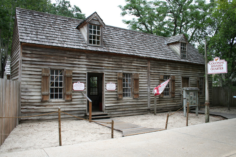 Source: WTL photograph© June 2007. Image: Wooden entrance building to the Colonial Spanish Quarter. Comments: Here's a tourist guide description of what awaits the tourist here at 53 St. George Street: "a living history museum set in 1740, showcasing a dozen historic homes and structures in a complex with traditional craftsmen—coopers, smiths, shoemakers, and more—in period dress tending to everyday life in the Presidio de San Agustín, a fascinating look into Florida's past" (Sandra Friend and Kathy Wolf, An Explorer's Guide: Orlando, Central and North Florida. Woodstock, Vermont: The Countryman Press, 2004, p. 339. Latin American humanities: Spanish colonial architecture and reenactment facility. |