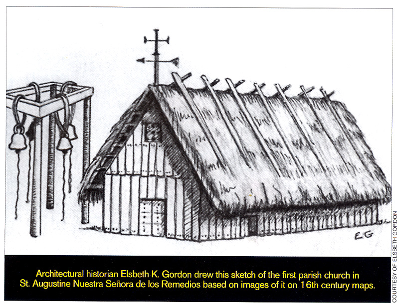 Source: Lilla Ross: "First Parish Church Uncovered; Archeological dig in St. Augustine finds evidence of church from 1572." St. Augustine Catholic, October, 2010: 10-11. See the caption under the drawing for credits and a statement about the source of the image.