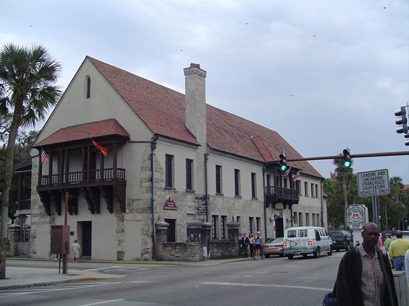 Comment: Currently there is a visitors information center and a museum in this building: Timucuan culture, Seminole Wars, the Flagler era. Two flags fly over this building's balcony. Why two? Which countries do they symbolize? The first building on this site belonged to Governor Gonzalo Méndez de Canzo about 1598. This building was replaced by a two-story masonry building, which was burned down by the British in 1702, rebuilt by the Spaniards in 1706, and renovated in 1759. The last Spanish governor to live here was Don Enrique White, who died in 1811 in the Second Spanish Period. Thereafter, at the very end of the Second Spanish Period, the building was used for apartments and offices. When the United States took over Florida in 1821 (the American Period), the building was used as a courtroom, legislative council meeting room, and Florida's first Capitol. Later, it became a courthouse again, an office building, and a post office. It now houses the Government House Museum and offices of the Historic St. Augustine Preservation Board. In short, it is a building with a lot of history. When I have visited it, it gives me a very Spanish sense of place, style, and ethos. Note also, that king Felipe VI of Spain addressed a crowd in the Plaza de la Constitución (off left) from the center of the balcony you see on the east end of the building. See: => 450th Celebration. Note, also, that it was this king's royal namesake, Felipe II (1557–1598) who authorized Menéndez de Avilés to establish a permanent colony at St. Augustine.