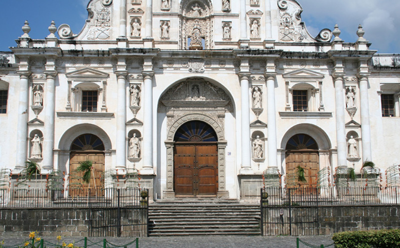 Source: WTL© digital photograph taken on site in Antigua, Guatemala (2008). Image: Detail of the façade of the Catedral de Santiago. Comments: This façade hints at the building's vast size (vast for its time). As it was constructed at the end of the 17th century, it became the most magnificent building in Central America: its central space measured roughly 300 feet long by 70 feet wide. It had a giant dome, five naves, 18 side and back chapels, and a high altar made of silver, gold, ivory, and mother-of-pearl. As one would expect, it had many statues of saints and paintings of religious scenes produced by great artists from Latin America and Catholic Europe. Despite the fact that this photograph is cropped on the right and left side, you can see external evidence of the five naves, three of which have doors. Right? |