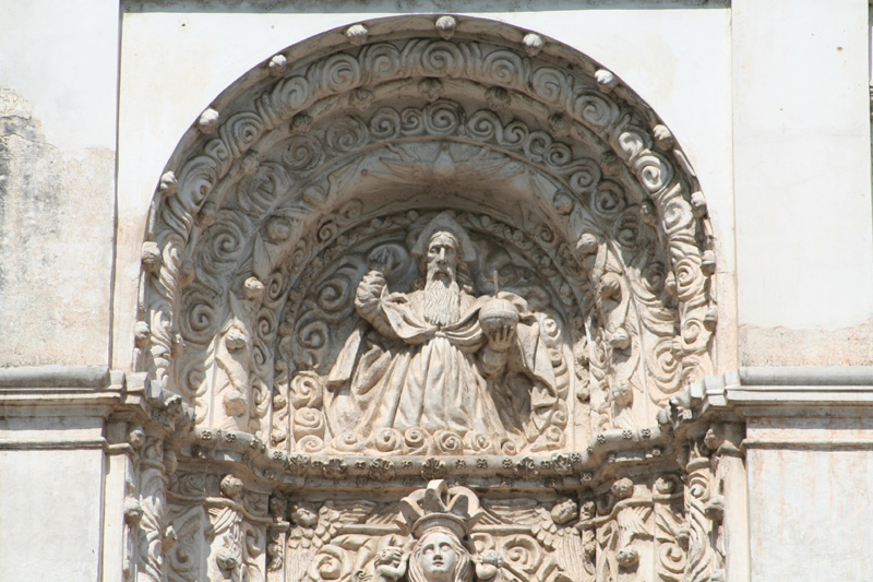 Source: WTL© digital photograph taken on site in Antigua, Guatemala (2008). Image: At the bottom center is the head of Mary Queen of Heaven. Above Mary's head is a high relief carving of the bishop responsible for building the cathedral. Humanities question: What does the ornate detail surrounding both figures say about or add to (or subtract from) the figures framed by the detail? |