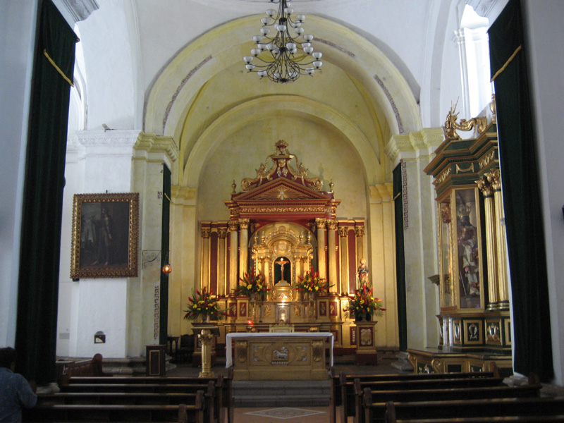 Source: WTL© digital photograph taken on site in Antigua, Guatemala (2008). Image: Now we visit the interior of the church, which is located immediately adjacent to the cathedral; that is, we see this church after having entered through the door in the cathedral's façade. In the next image we shall see a statue standing below and to the left of the picture on the left. Humanities questions: What is the name of this church? What is the style of the architecture? What is the style of the main altar? |