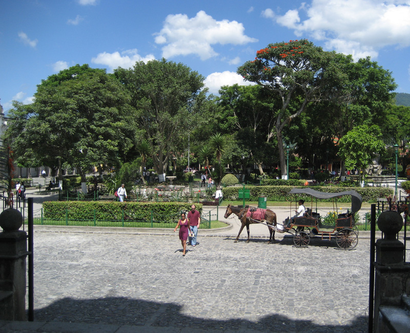 Source: WTL© digital photograph taken on site in Antigua, Guatemala. Comments: The professor-photographer is standing just outside the cathedral's main entrance, the one that is used only for Jubilee events, such as, for example, the visit from the Pope or at Easter. He is looking across the street toward the Parque Central, which, as you know, is a standard Spanish urban design feature that Spain laid out throughout the Americas beginning in the Renaissance. During the colonial period, this plaza mayor was the site of public events such as market days, fiestas, bullfights, military parades, and executions. |