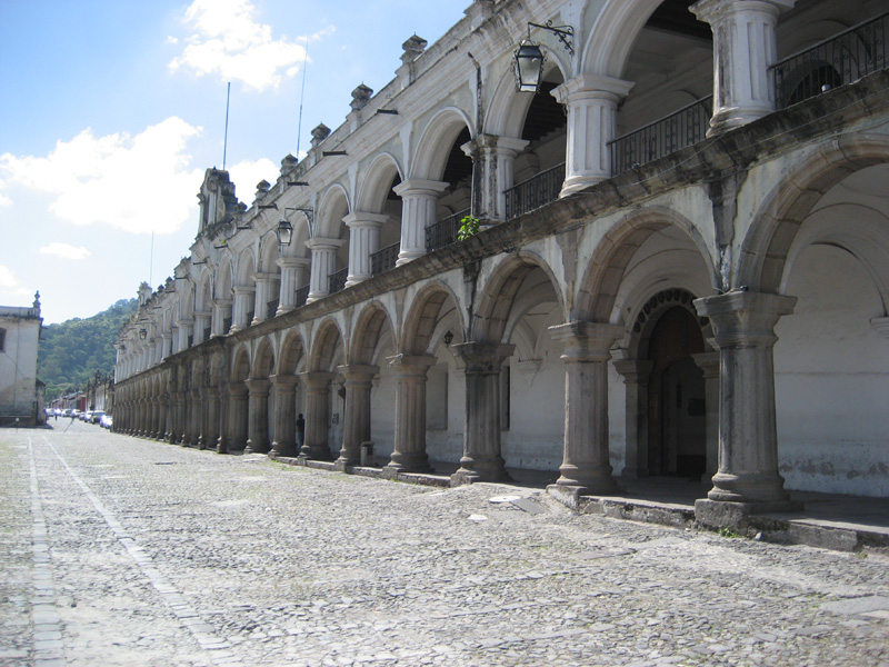 Source: WTL© digital photograph taken on site in Antigua, Guatemala. Comments: This is the Palacio de los Capitanes (Palace of the Captains General). The Captains General were the governors of Guatemala under the Virrey de Nueva España (Viceroy of New Spain; i.e., Mexico and most of Central America) during the colonial period. Begun in 1557 in the Renaissance architectural style, it was destroyed by the 1773 earthquake and subsequently reconstructed in a combination Renaissance and Neoclassical style. It was the seat of Spanish viceregal governmental power from Chiapas in southern Mexico to the Costa Rica-Panamá border (where Colombia and South America started in those days). Nowadays, it houses Guatemala's tourism office, INGUAT, and the Sacatepéquez police department. Incidentally, it is famous for its 27 arches on the ground floor and the first floor (la planta baja y la primera planta). |