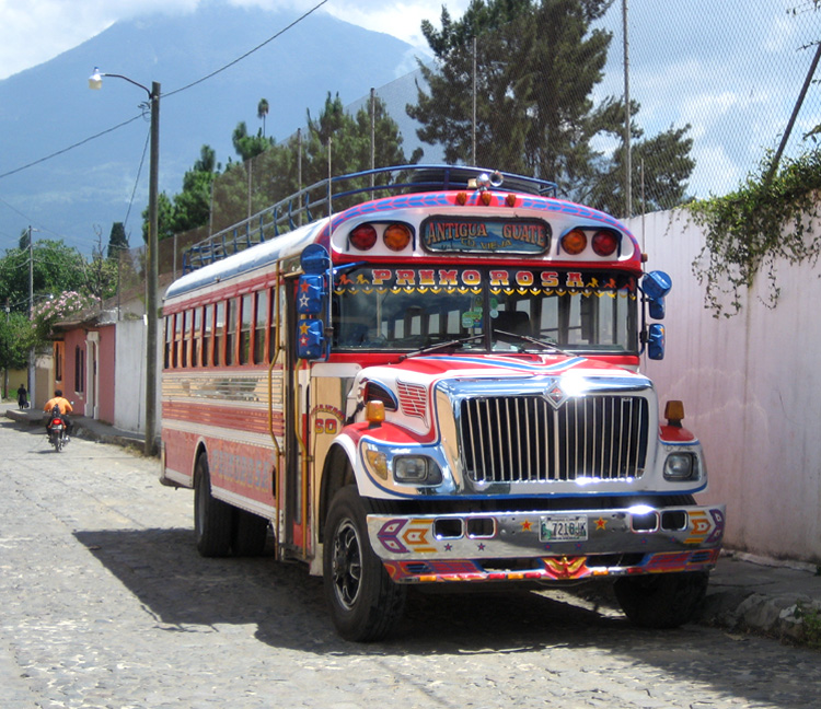 Source: WTL© digital photograph taken on site in Antigua, Guatemala. Comments: Another bus parked on a street on the edge of the city. Obvious humanities question: What relationship do you see between this and other busses like it on the one hand, and Guatemalan textiles on the other hand? |