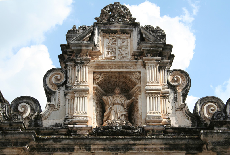 Source: WTL© digital photograph taken on site in Antigua (2008). Comments: Here we back up slightly and look at detail above the entrance door. Humanities topic: Referring to the description in Antigua #18, describe the contents and style of what you see here. Interpret the historical personage who is most likely represented by the statue. (Hint: you may wish to use the following: => Authoritative Link, or, of course, others.) |