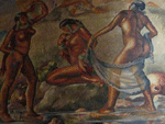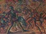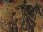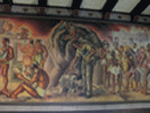 Source: WTL© digital photograph (2008) taken on site in Guatemala City. Comments: In 1944, after the dictator Ubico was overthrown, the Guatemalan muralist Alberto Gálvez Suárez was commissioned to create a series of murals on Guatemalan history and culture over a staircase in the Palacio Nacional. We shall view (i.e., read) them from left to right. The murals are titled (a) "The message of Popol"; (b) "The Religion of the Mayas"; (c) "The Technical and Spiritual Language of the Mayas"; (d) "The Clash Between the Spaniards and the Indians"; and (e) "The Fusion of Cultures". A supplementary mural represents the figure of Don Quixote. Image Sequence: Click on #11 to begin the tour. |
