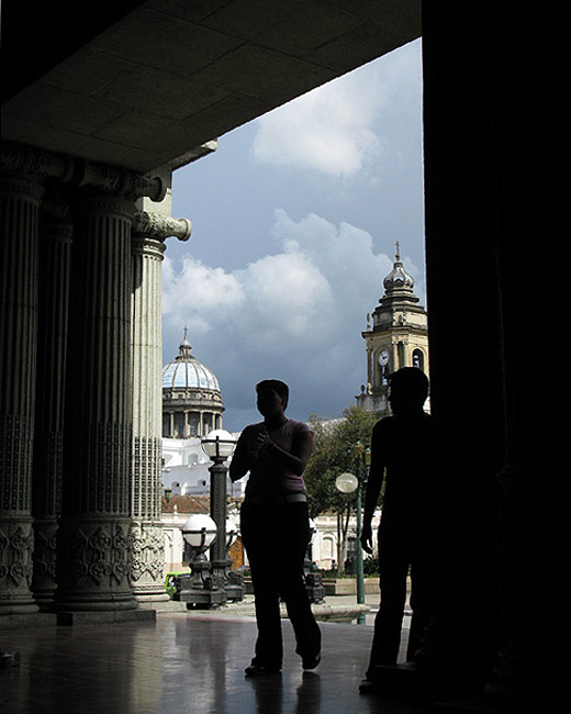 Source: WTL© digital photograph (2008) taken on site in Guatemala City. Image: From the same place where the previous photos were taken, the photographer turned around and shot this image through the palace's columns toward the cathedral. Meanwhile a couple of young Guatemalans were arriving to tour the palace. (The children's mother was sitting off to the left.) |