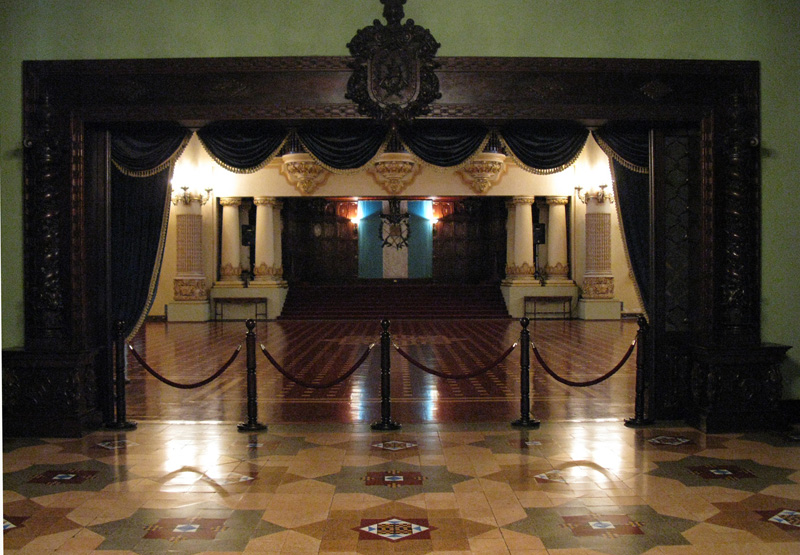 Source: WTL© digital photograph (2008) taken on site in Guatemala City. Comments: Here you see one of the official reception rooms with its inlaid floors, velvet drapes, polished wood, carved stone, and gold leaf-decorated columns. |