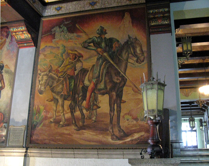 Source: WTL© digital photograph (2008) taken on site in Guatemala City. Comments: Separate from the murals depicting Guatemalan history, on the right wall of this stairwell, is this mural showing Don Quixote and Sancho Panza, the main characters in Miguel de Cervantes' novel Don Quixote de la Mancha (1605, 1615). Humanities Question: What does this book and these two characters have to do with Guatemalan history, culture, humanities? |