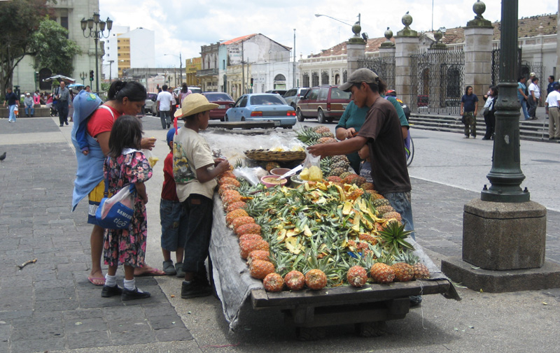 Source: WTL© digital photograph (2008) taken on site in Guatemala City. Comments: Back on the Parque Central, with the Palacio Nacional to the left and the Cathedral to the right, we see this fruit vendor. Humanities issue: Please comment. |