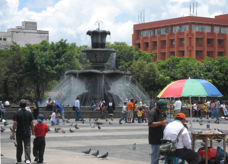 Source: WTL© digital photograph (2008) taken on site in Guatemala City. Comments: Now we are walking west across the Parque Central from the Cathedral (behind us), past the Palacio Nacional (off to the right), and toward the National Library. Humanities question: What elements in the image give you the idea that it is a scene from Latin America? |