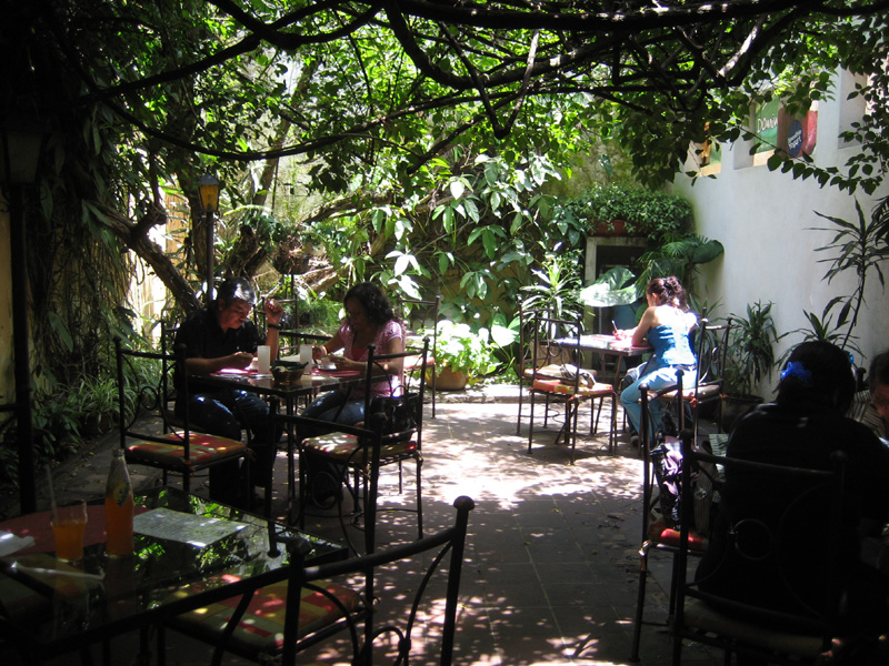 Source: WTL© digital photograph (2008) taken on site in Guatemala City. Comments: Two blocks west of the Parque del Centenario, on 6a Calle, is a fine restaurant, the Café de Imerci. Here you see the inner patio dining area, and in the foreground left you see the photographer-professor's table. Humanities question: What is Hispanic about this scene? |