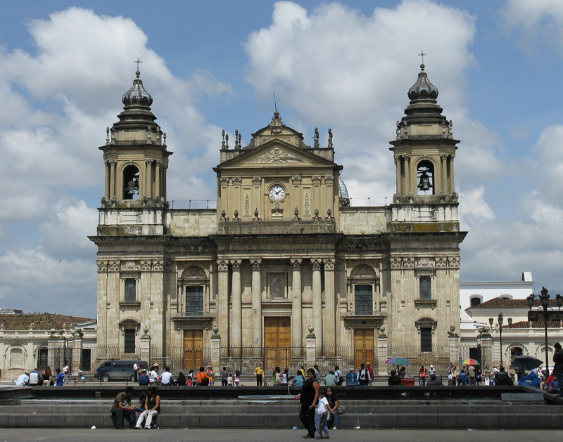 Source: WTL© digital photograph (2008) taken facing east from the Parque Central and looking at the Catederal de Santiago de Guatemala. Comments: The façade of this impressive cathedral dates from the Baroque and Neoclassical periods. However, the full cathedral was completed and finished after the 1868 earthquake. For a tour inside the cathedral, see: => Guate City #18a. Humanities questions: What does the fact this this cathedral is dedicated to Santiago communicate to your about Latin America in general and Guatemala in particular? What practical benefit does this solid and rather squat architecture serve? |