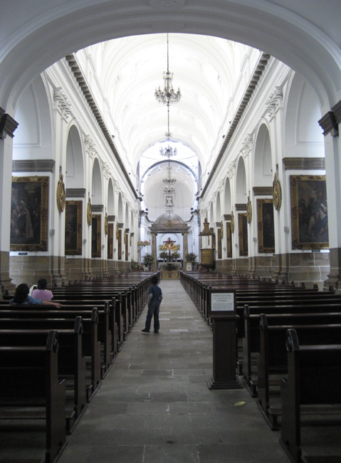 Source: WTL© digital photograph (2008) taken on site in Guatemala City. Comments: Here we see the central aisle in the cathedral's nave. There are two more aisles, one on each side of the nave. Each pillar features a station of the cross and a colonial painting. Humanities question: How would you describe this architectural style? What is your own personal opinion and reaction to this view of the cathedral's nave? |